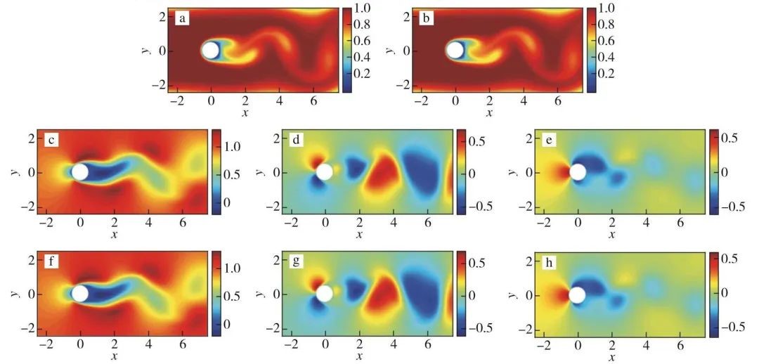 图3 通过圆柱体矩形训练区域的二维流动:(a)输入的浓度;(b)人工智能模型回归出的浓度。根据纳维-斯托克斯方程由图(b)回归出来的速度场u(c)、v(d)和压力场p(e)以及用来对照的同一时刻速度场u(f)、v(g)和压力场p(h)。其中横纵坐标表示二维流动的方向,数值分别表示沿着x,y方向的位移。引自Raissi et al. (2020)