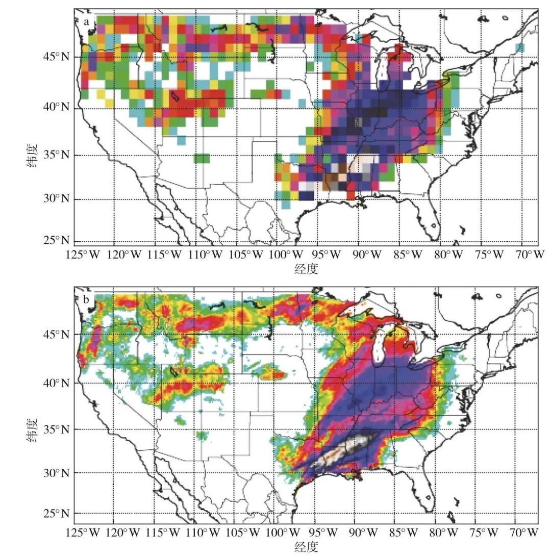 图6 降水分布:低分辨率1.0°(a,约100 km)和通过DeepSD降尺度后高分辨率1/8°(b,约12.5 km)的结果(引自Vandal et al., 2017)