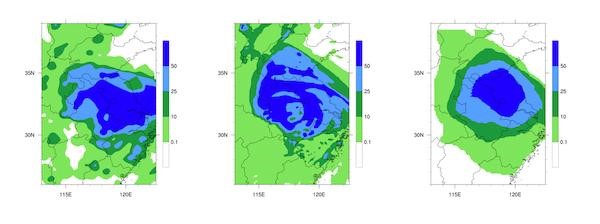 图说:2021年7月27日8时到28日8时台风“烟花”带来的降水预报和实测比对(a为观测,b为数值预报,c为人工智能预报)